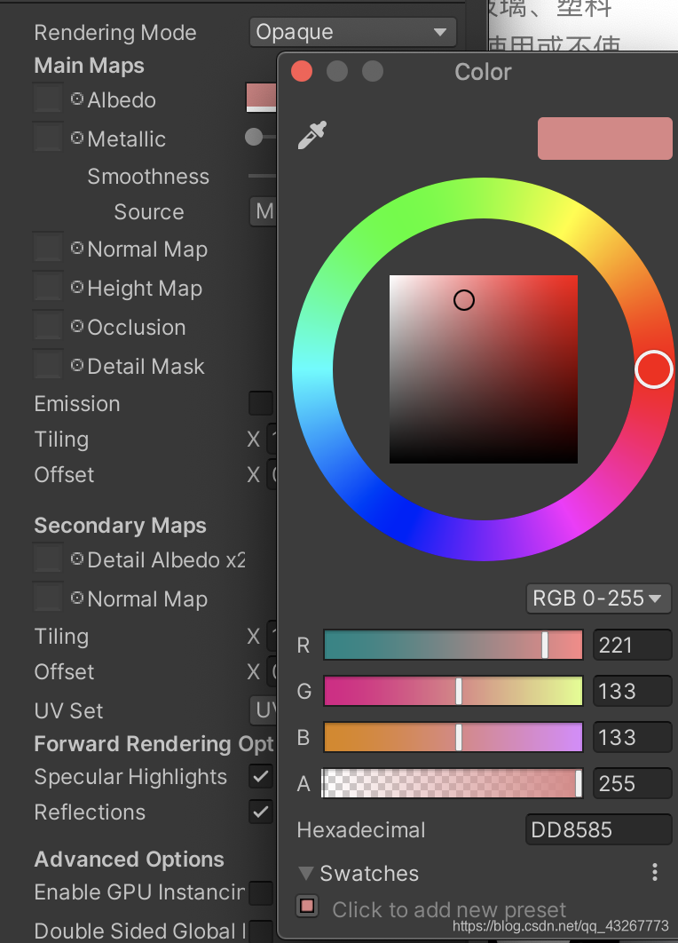 - **抉择适合内容,如 [Albedo Color and Transparency](https://docs.unity3d.com/Manual/StandardShaderMaterialParameterAlbedoColor.html),寻找适合素材,用博客展现相干成果的出现**