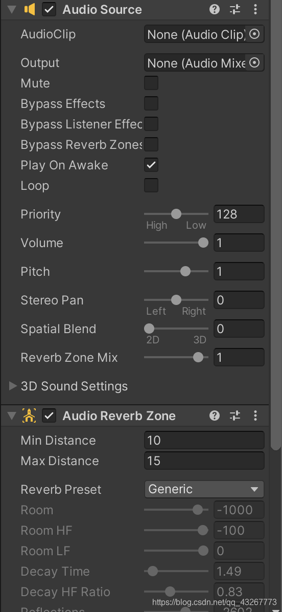 首先创立一个新的空的对象,而后增加部件 `Audio Source` 和 `Audio Reverb Zone`
