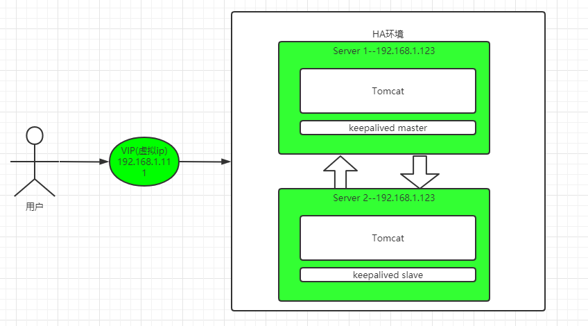 用户访问VIP(虚拟ip),keepalived将请求转发到master服务器的tomcat中,若master服务器的tomcat出现故障,则keepalived自动将请求转发到slave服务器中,此时slave服务器成为master。若server 1恢复运行,则成为slave服务器。